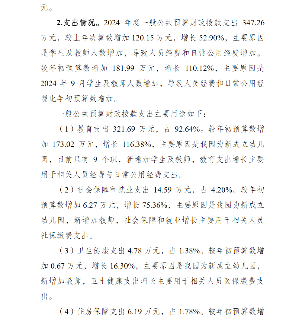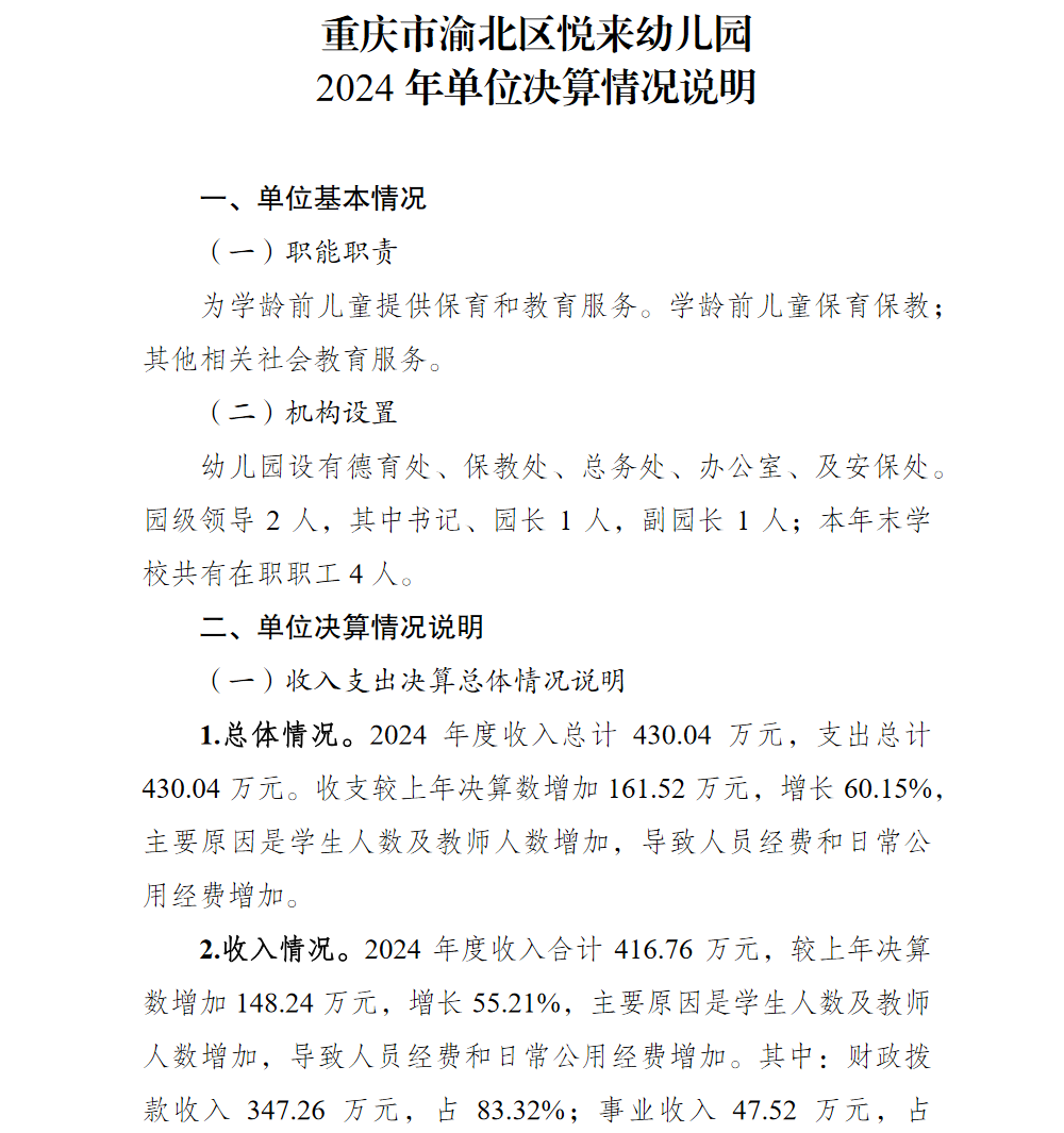 重庆市渝北区悦来幼儿园2024年单位决算情况说明