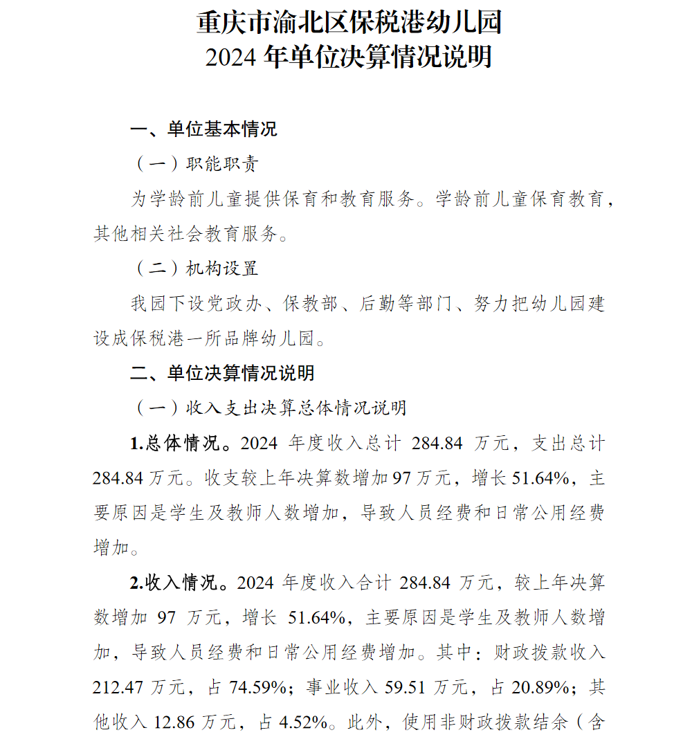 重庆市渝北区保税港幼儿园2024年单位决算情况说明