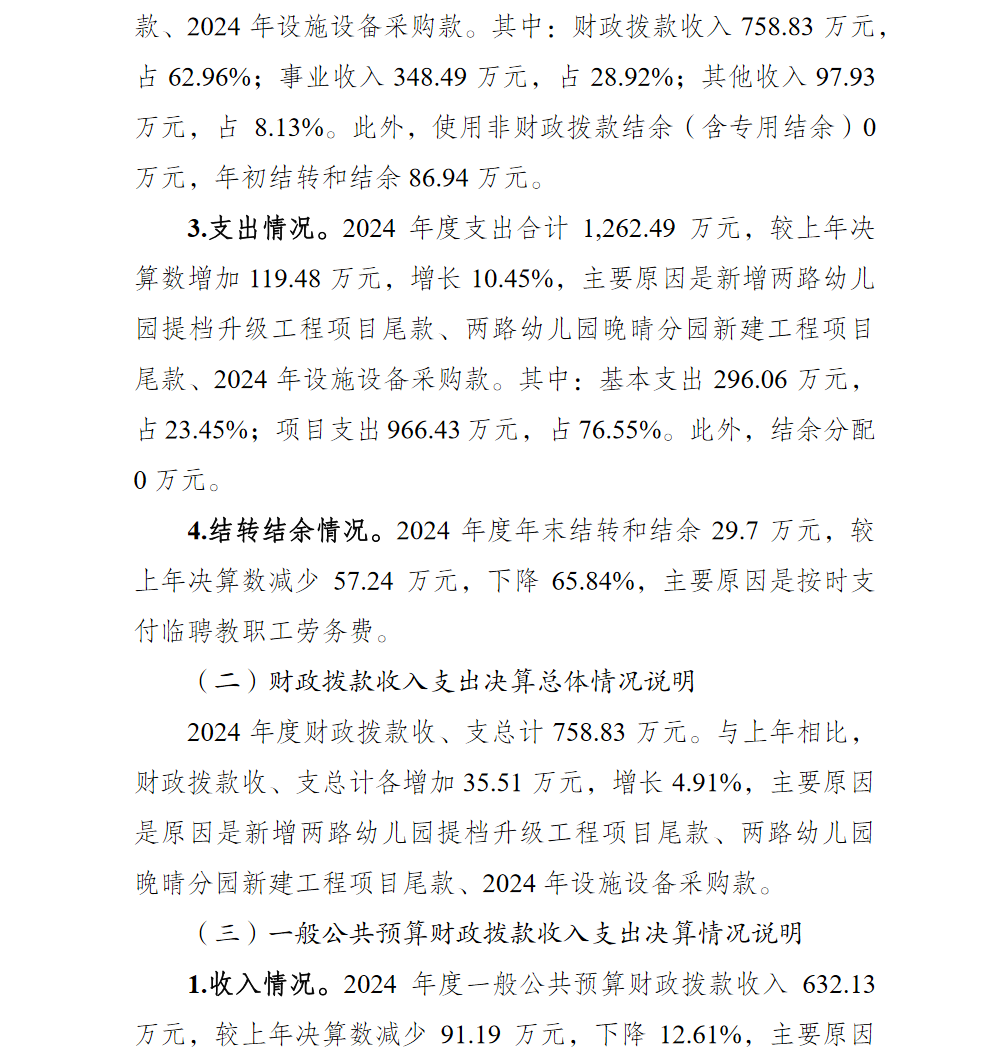 重庆市渝北区两路幼儿园2024年单位决算情况说明