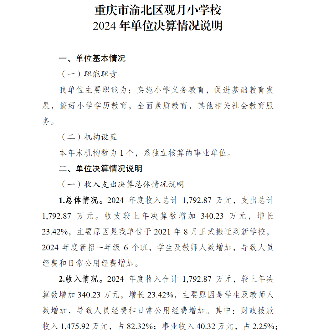 重庆市渝北区观月小学校2024年单位决算情况说明