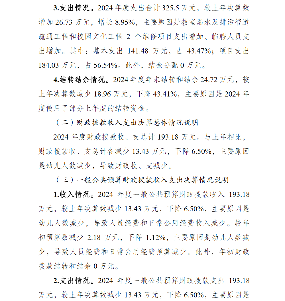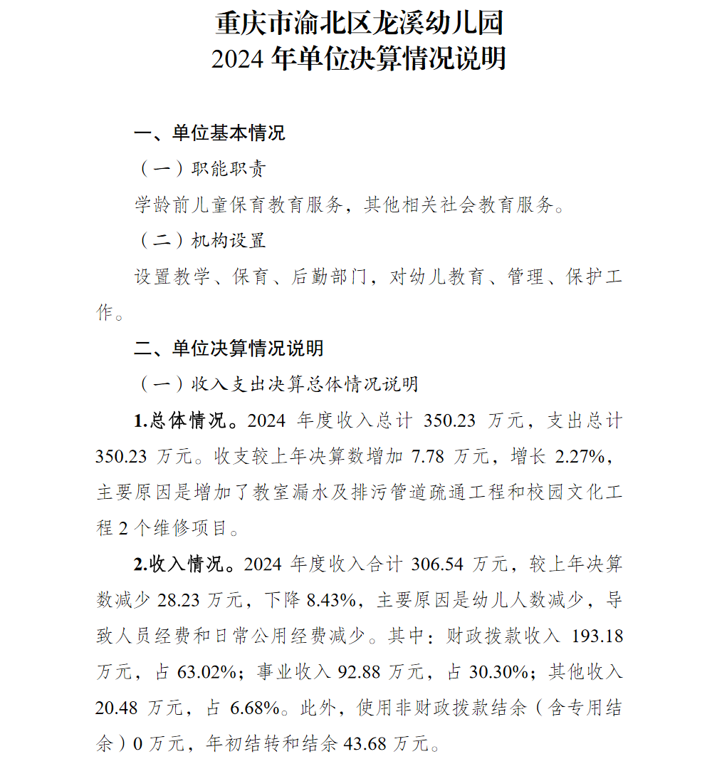 重庆市渝北区龙溪幼儿园2024年单位决算情况说明