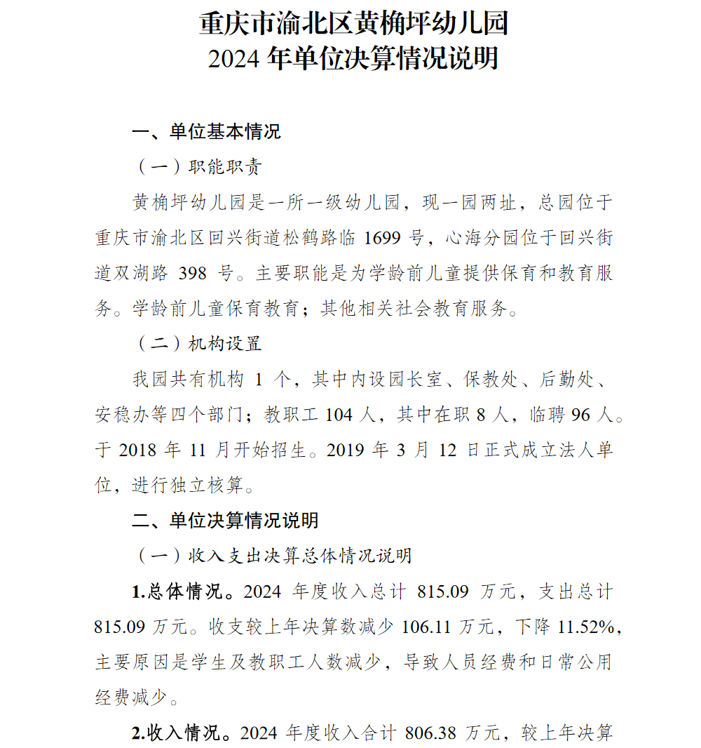 重庆市渝北区黄桷坪幼儿园2024年单位决算情况说明