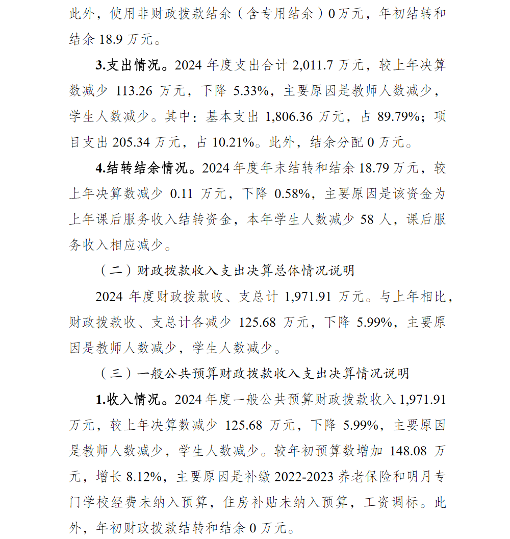 重庆市渝北区大盛学校2024年单位决算情况说明