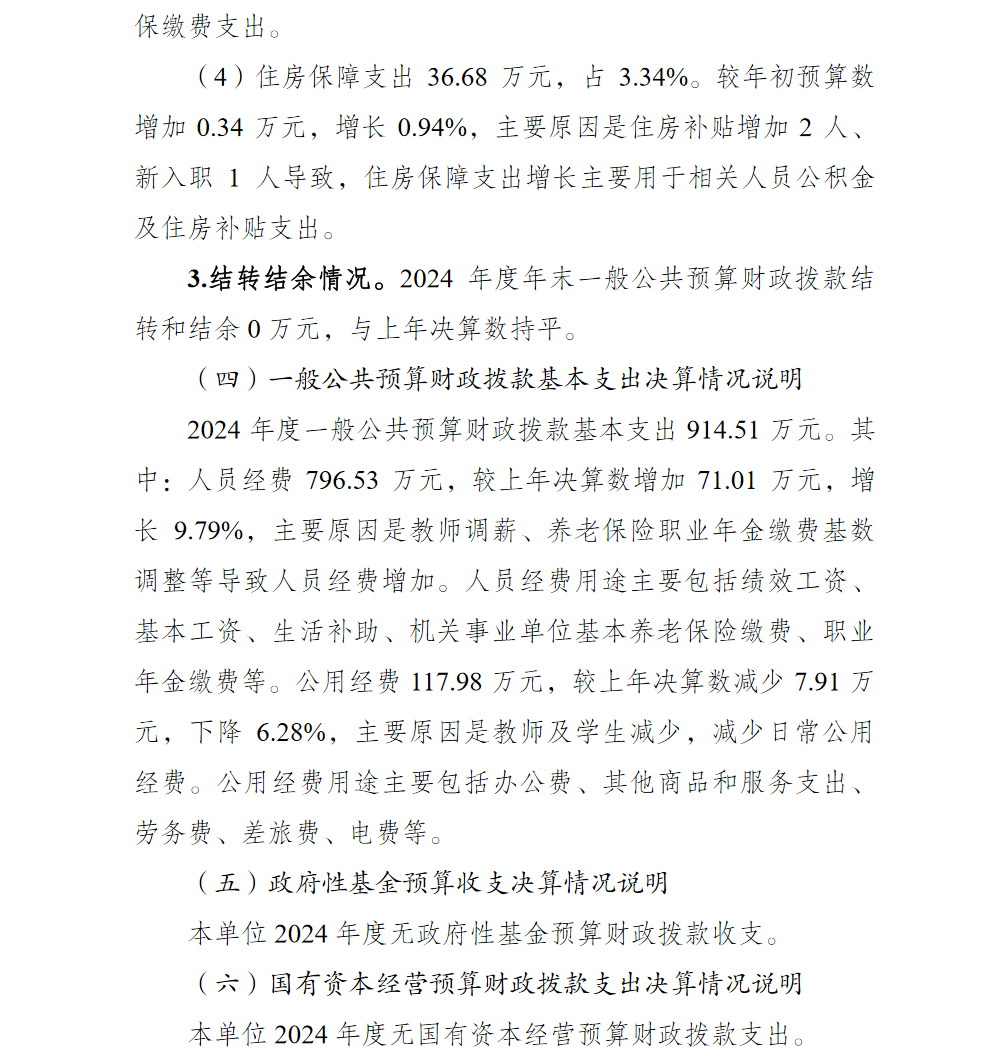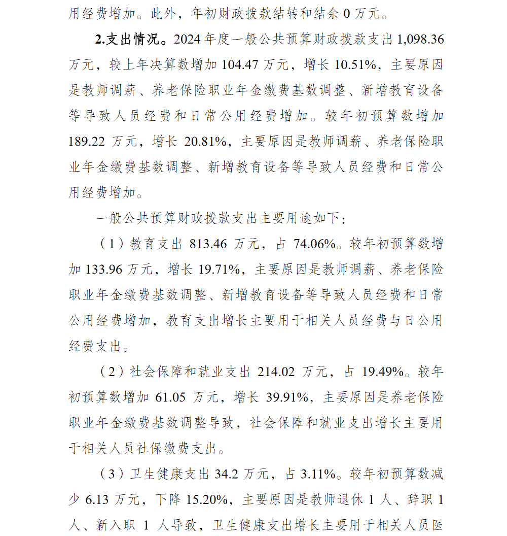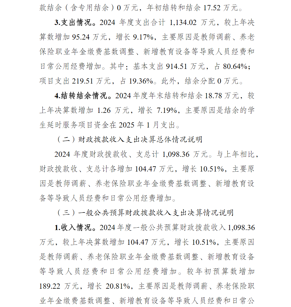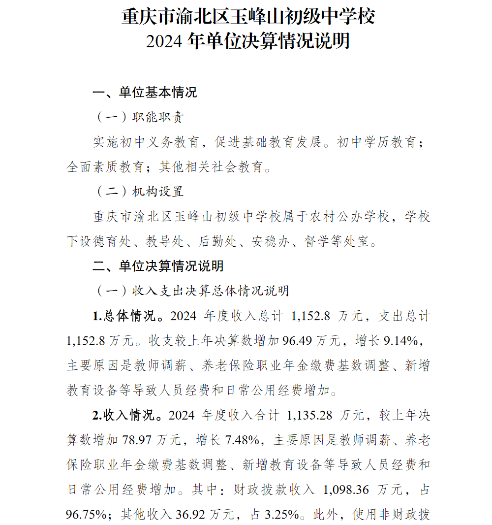 重庆市渝北区玉峰山初级中学校2024年单位决算情况说明