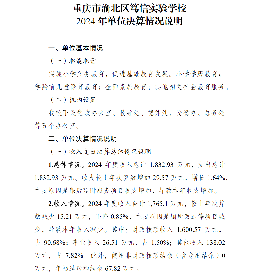 重庆市渝北区笃信实验学校2024年单位决算情况说明
