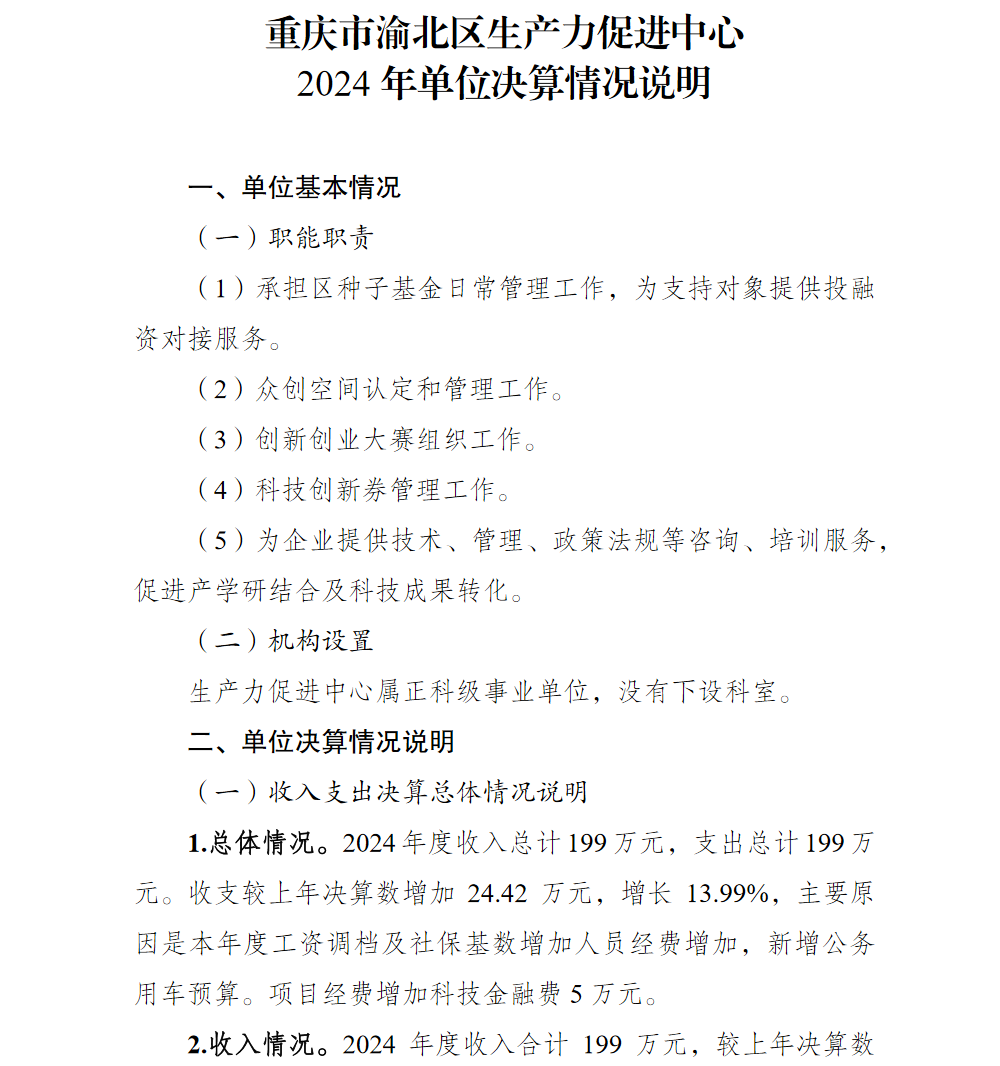 重庆市渝北区生产力促进中心2024年单位决算情况说明