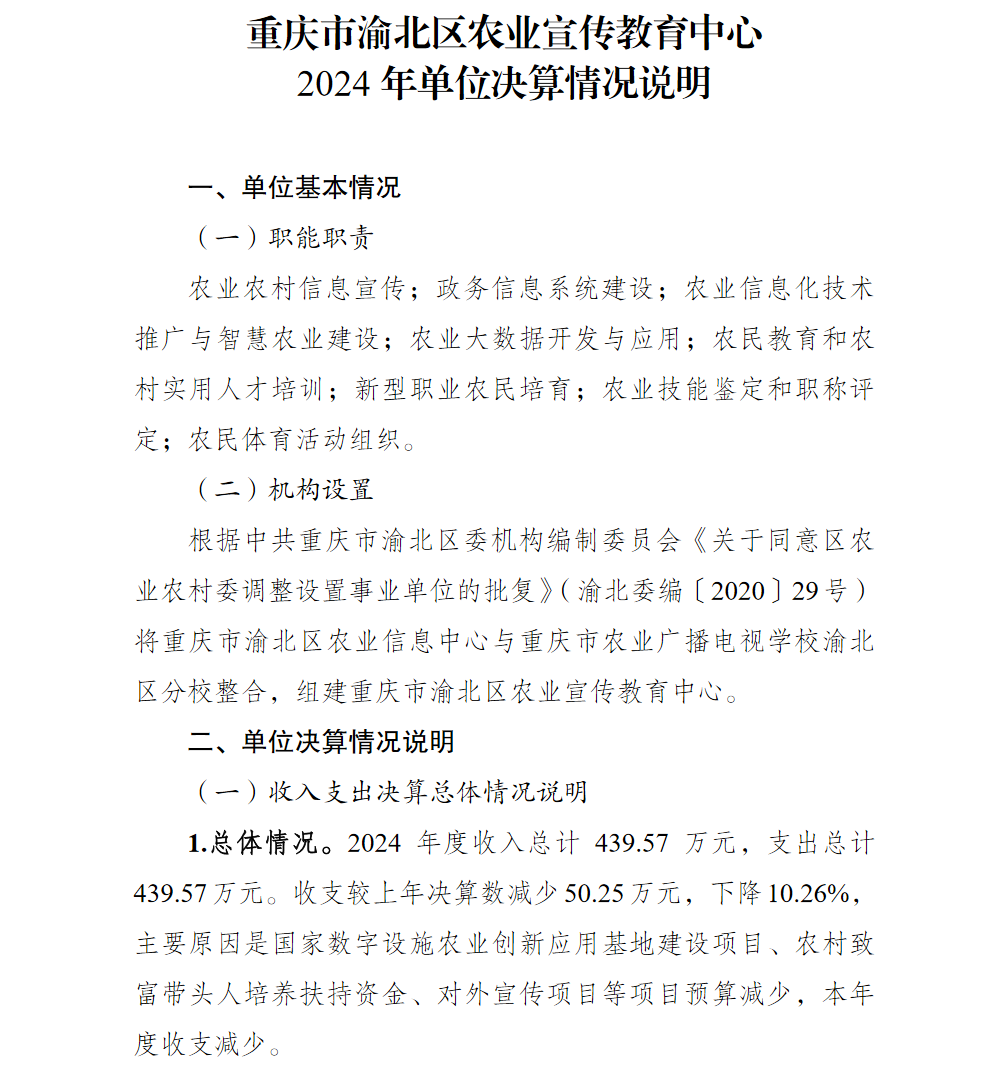 重庆市渝北区农业宣传教育中心2024年单位决算情况说明