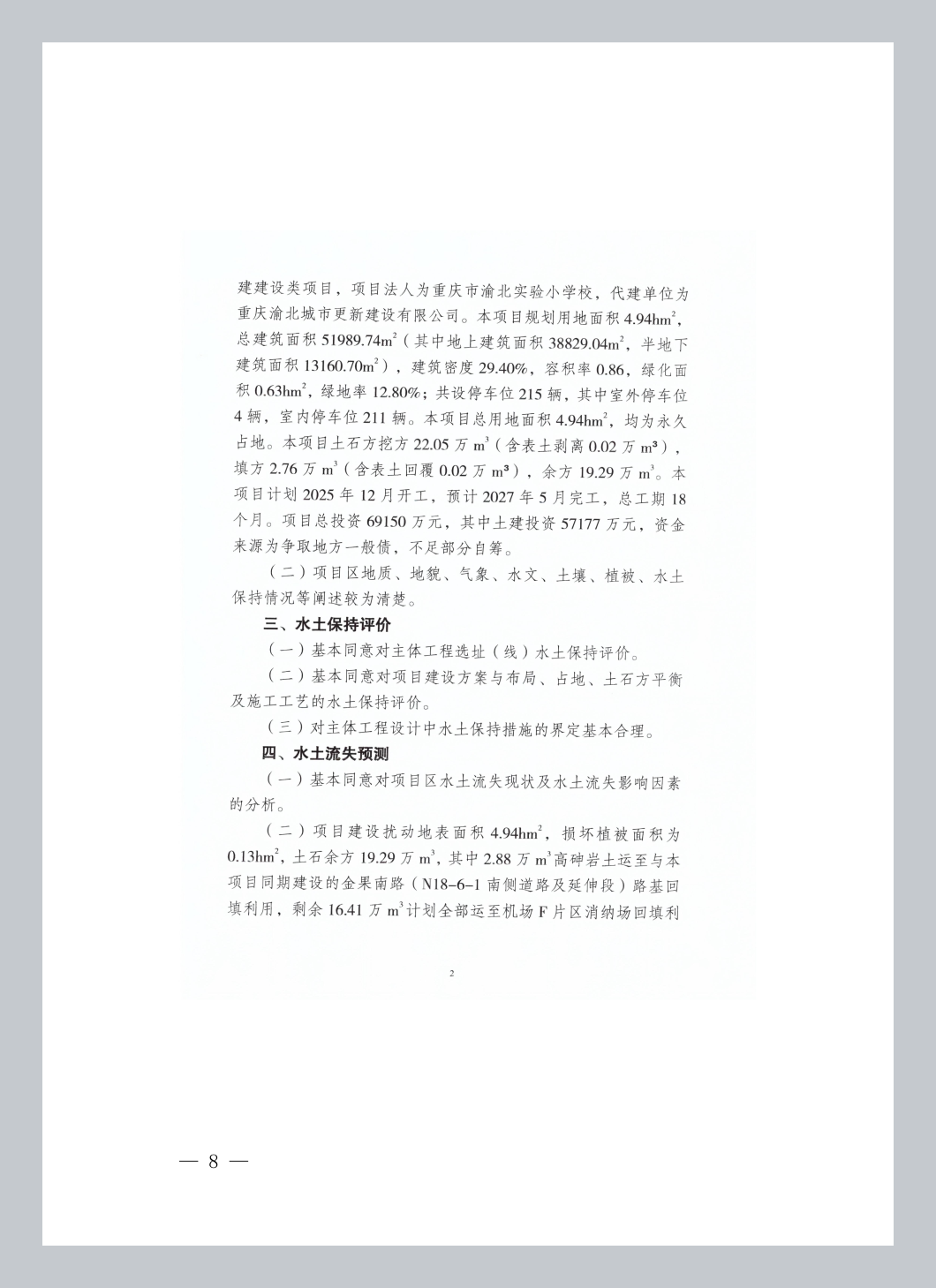渝北N18-6-3小学工程位于重庆市渝北区宝圣湖街道,为新建建设类项目,项目法人为重庆市渝北实验小学校,代建单位为重庆渝北城市更新建设有限公司。本项目总建筑面积51989.74m2(其中地上建筑面积38829.04m2,半地下建筑面积13160.70m2),建筑密度29.40%,容积率0.86,绿化面积0.63hm2,绿地率12.80%。本项目总用地面积4.94hm2,均为永久占地。土石方挖方总量22.05万m3(含表土剥离0.02 万m3),填方总量2.76万m3(含表土回覆0.02万m3),余方19.29万m3,其中2.88万m3高砷岩土运至与本项目同期建设的金果南路(N18-6-1南侧道路及延伸段)路基回填利用,剩余16.41万m3全部运至机场F片区消纳场回填利用。本项目计划2025年12月开工,预计2027年5月完工,总工期18个月。项目总投资69150万元,其中土建投资57177 万元,资金来源为争取地方一般债,不足部分自筹。