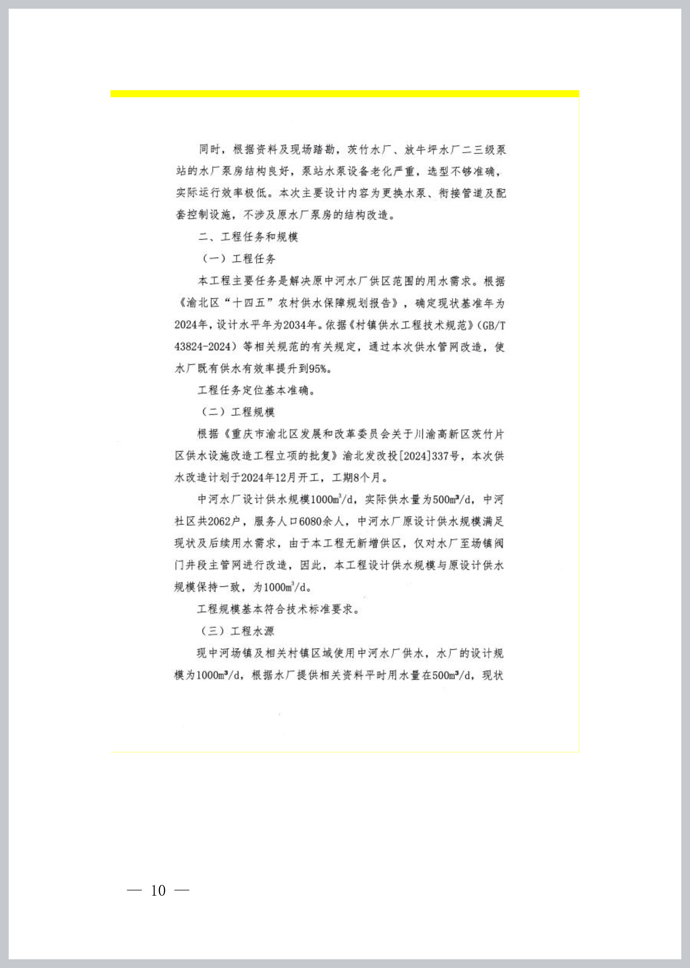 本工程主要任务是解决原中河水厂供区范围的用水需求。根据《渝北区“十四五”农村供水保障规划报告》,确定现状基准年为2024年,设计水平年为2034年。依据《村镇供水工程技术规范》(GB/T 43824-2024)等相关规范的有关规定,通过本次供水管网改造,使水厂既有供水有效率提升到95%。