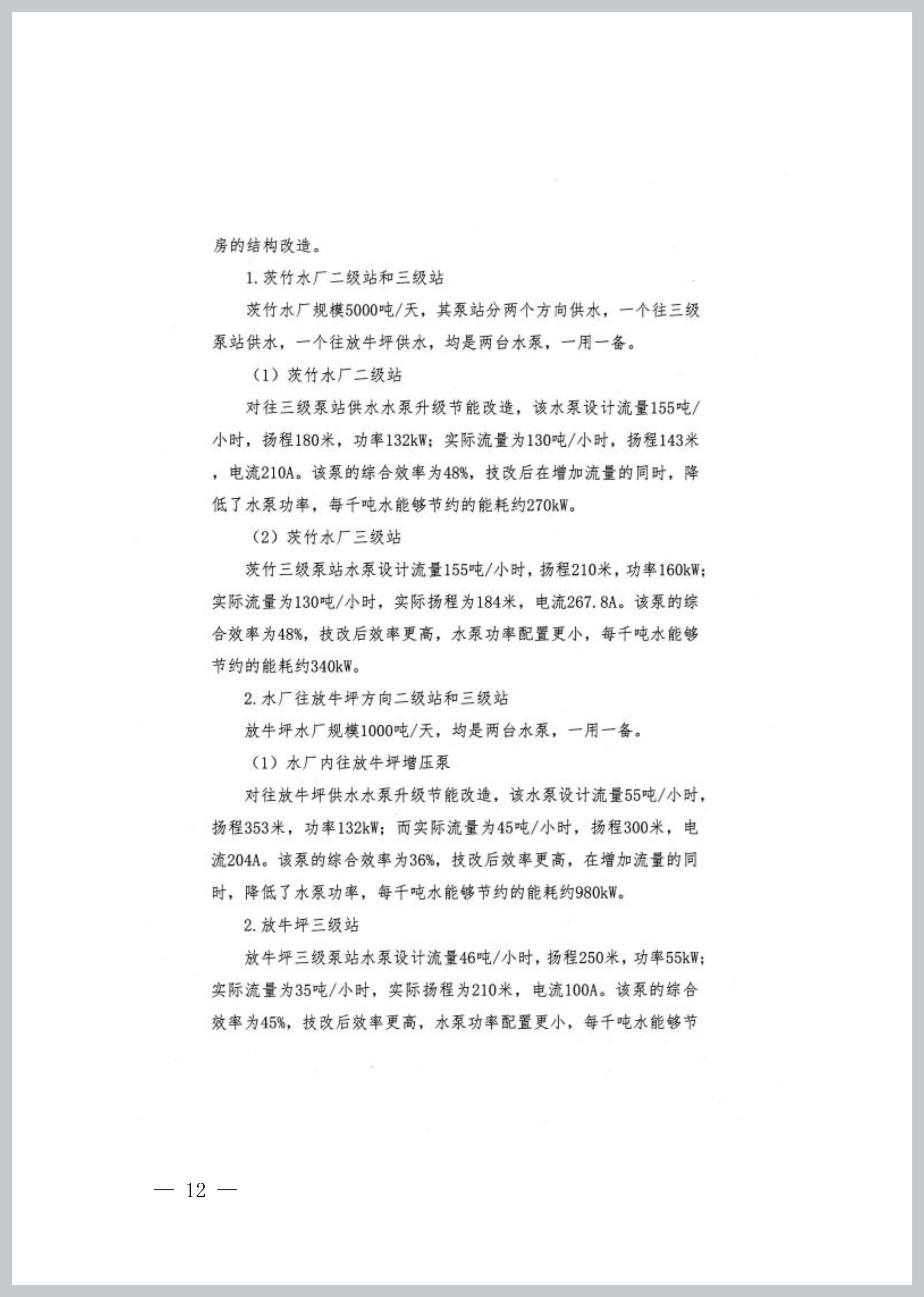 放牛坪三级泵站水泵设计流量46吨/小时,扬程250米,功率55kW;实际流量为35吨/小时,扬程为210米,电流100A。该泵的综合效率为45%,技改后效率更高,功率配置更小,每千吨水能够节约的能耗约480kW。