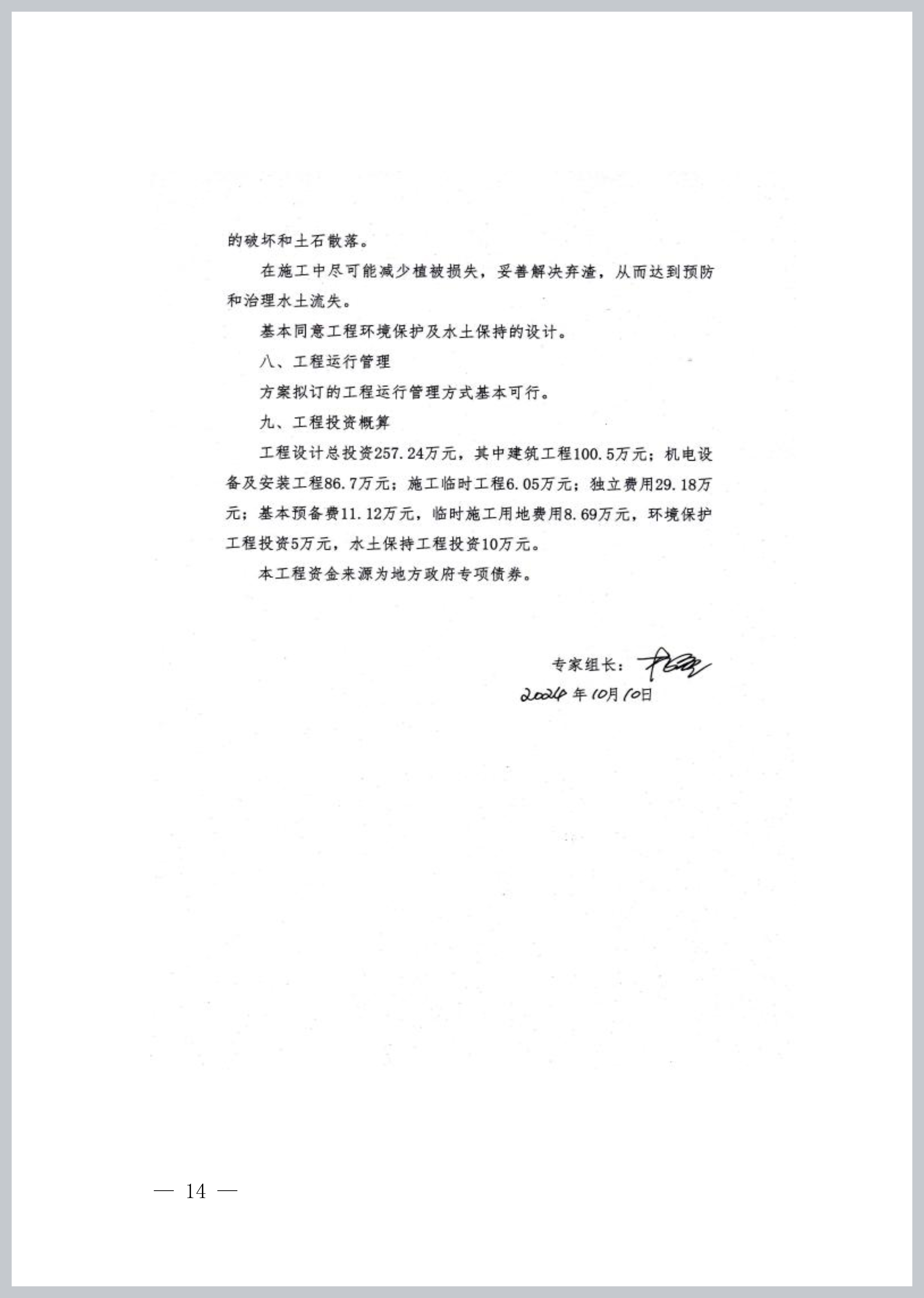 工程概算总投资257.24万元,其中建筑工程100.5万元;机电设备及安装工程86.7万元;施工临时工程6.05万元;独立费用29.18万元;基本预备费11.12万元,建设征地补偿费8.69万元,环境保护工程投资5万元,水土保持工程投资10万元。本工程资金来源为地方政府专项债券。