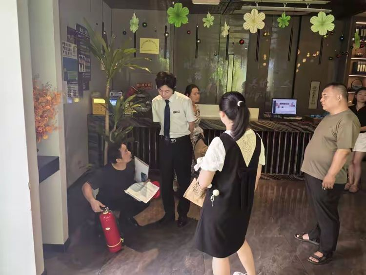 6.2025年8月25日下午,回兴街道紧急服务岗工作人员及专家与康晖路社区工作人员一同到喜悦汇商圈检查鑫漫足艺、缪漫洗浴店的消防安全检查。