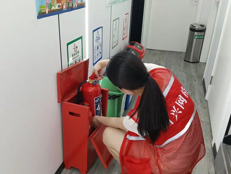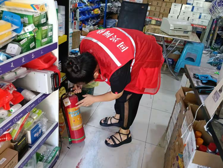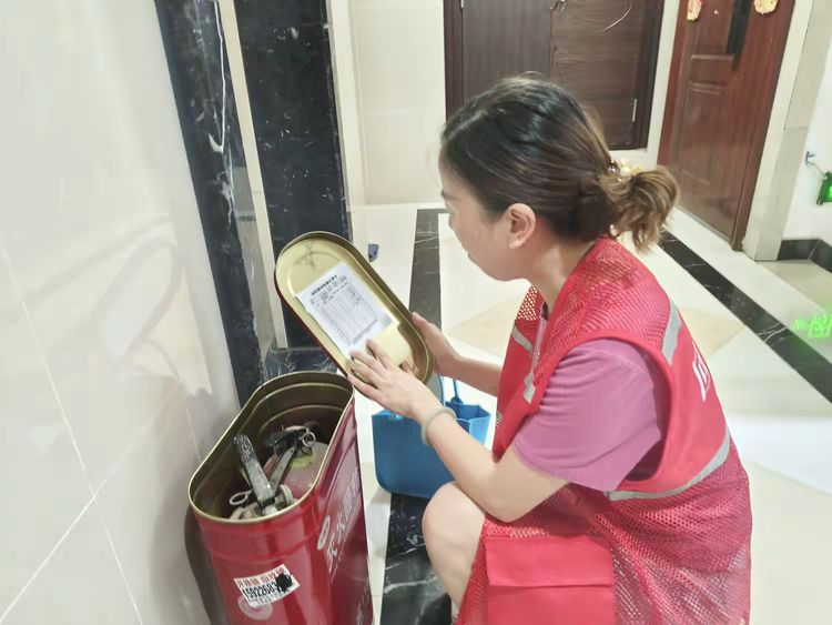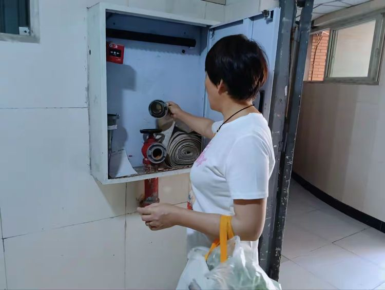 13.2025年8月27日,龙石路社区网格员对国际家纺城小区高层建筑楼栋的室内消火栓、灭火器进行安全排查。