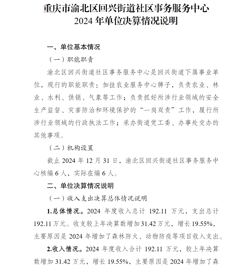 重庆市渝北区回兴街道社区事务服务中心2024年单位决算情况说明