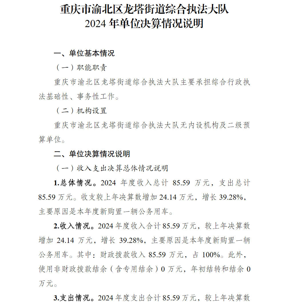 重庆市渝北区龙塔街道综合行政执法大队2024年单位决算情况说明