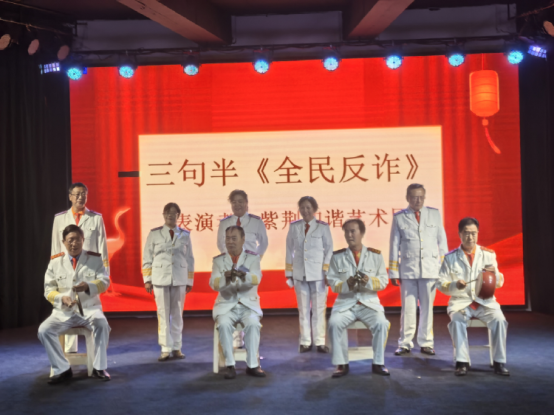 在众多节目中,紫荆和谐艺术团带来的三句半《全民反诈》尤为吸睛。演员们身着整齐的白色演出服,手持快板、锣鼓等道具,以“三句长、一句短”的独特形式,将非法集资、养老诈骗等骗局的套路巧妙融入台词。“诈骗手段花样多,高息理财是诱饵,老年朋友要警惕,别信!”“陌生链接不能点,个人信息不外泄,遇到可疑快报警,牢记!”一句句押韵直白的唱词,配合着节奏明快的乐器声响,把枯燥的防非反诈知识变得趣味盎然,台下观众听得津津有味,不时报以热烈掌声。