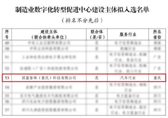 近日,工业和信息化部公示了2025年制造业数字化转型促进中心建设主体拟入选名单,全国共62家单位入选。渝北区企业国器智眸(重庆)科技有限公司成功上榜,成为重庆市唯一入选单位,标志着重庆在制造业数字化转型领域获得国家级认可。
