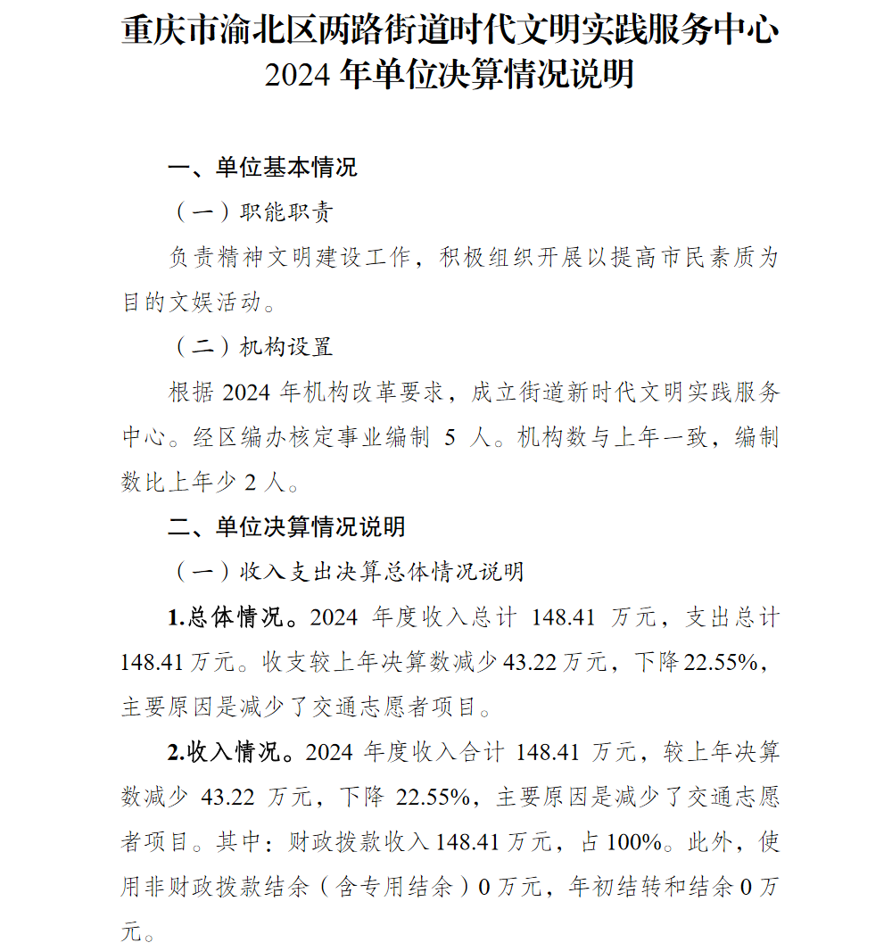 重庆市渝北区两路街道新时代文明实践服务中心2024年单位决算情况说明