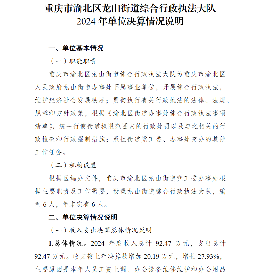 重庆市渝北区龙山街道综合行政执法大队2024年单位决算情况说明