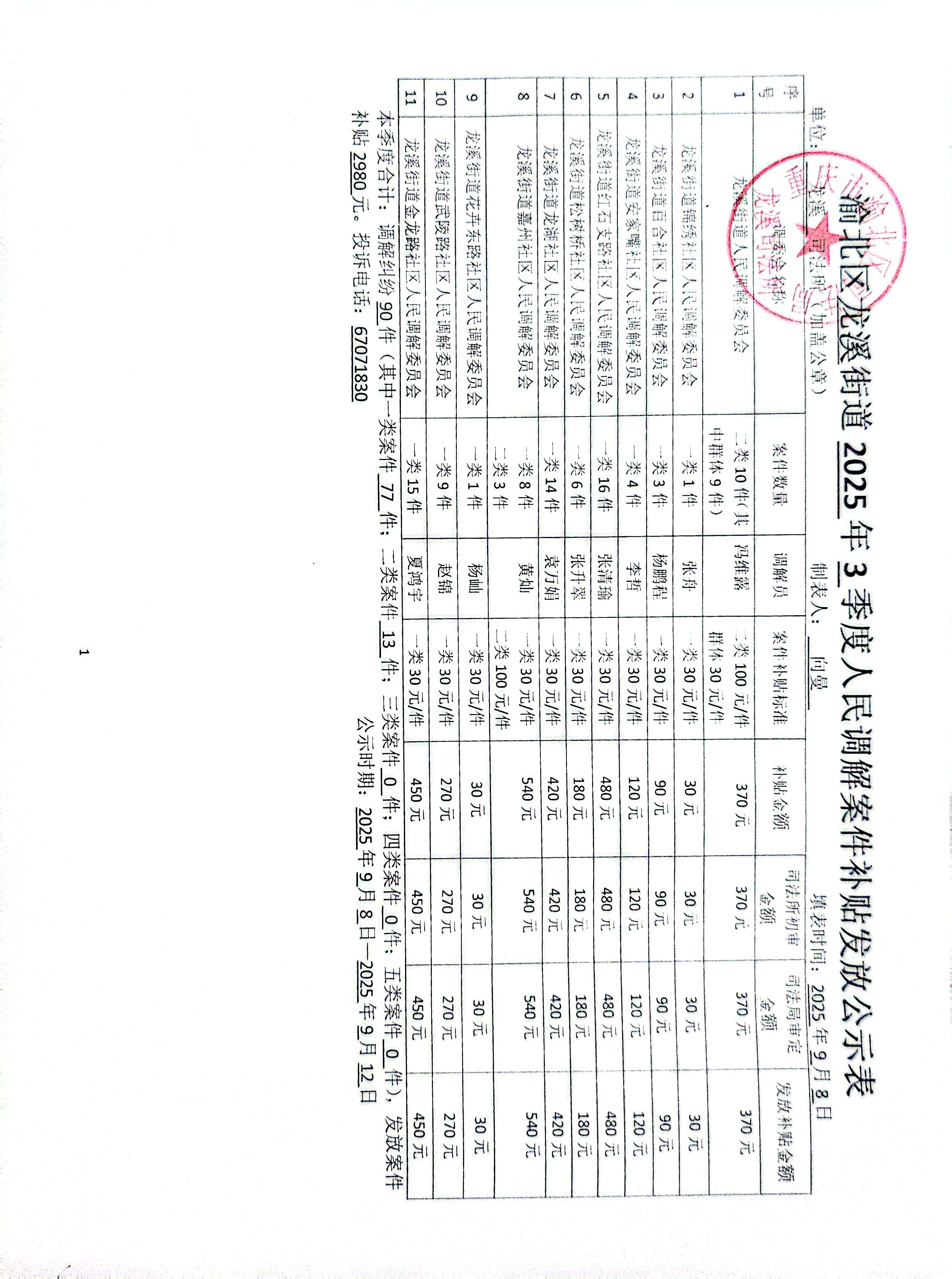 2025年第3季度龙溪街道人民调解案件补贴公示