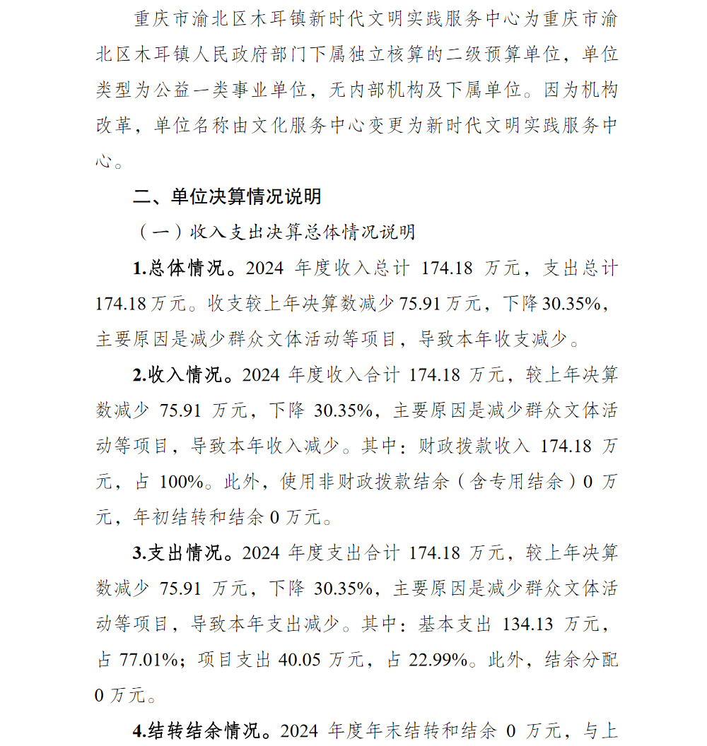 重庆市渝北区木耳镇新时代文明实践服务中心2024年单位决算情况说明