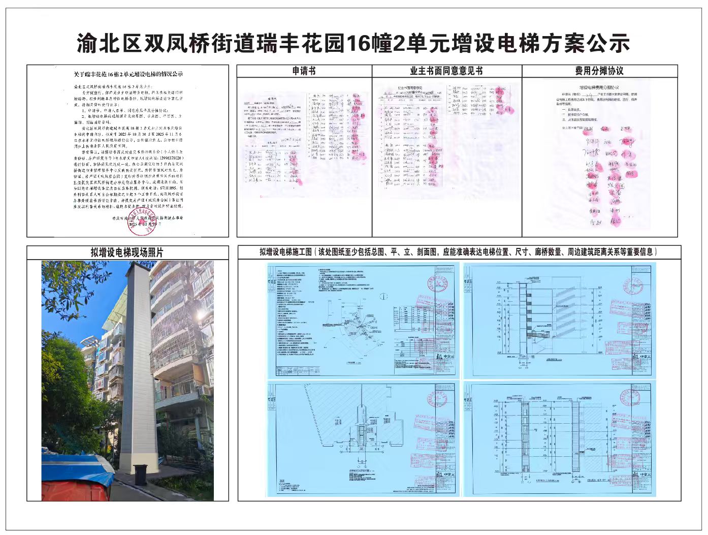渝北区双凤桥街道瑞丰花苑16栋2单元业主对本单元增设电梯的申请内容,拟定于2025年10月30日至2025年11月6日在本单元增设电梯现场进行公示,公开征询意见,公示材料将同步上传渝北区人民政府官网。