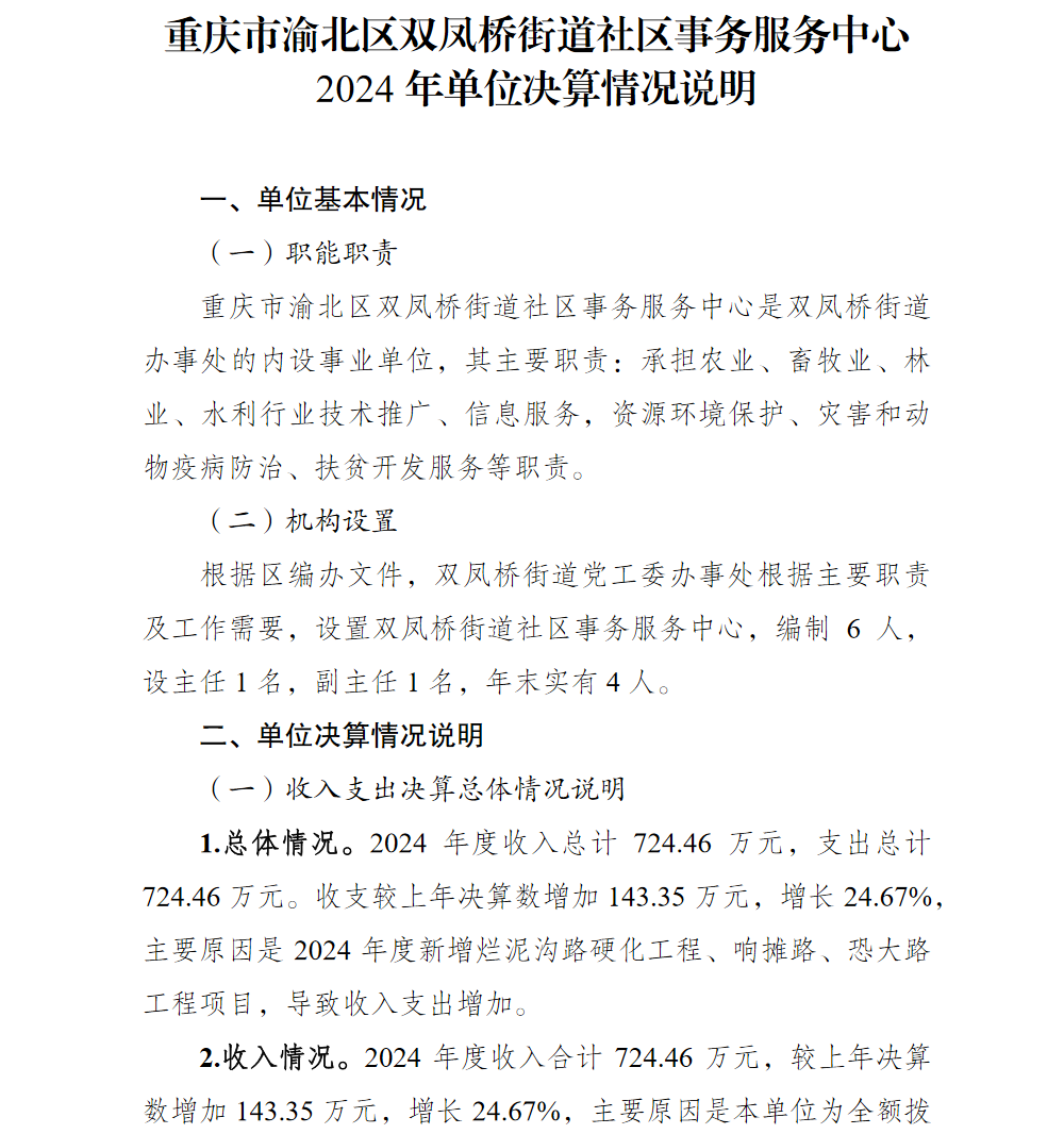 重庆市渝北区双凤桥街道社区事务服务中心2024年单位决算情况说明