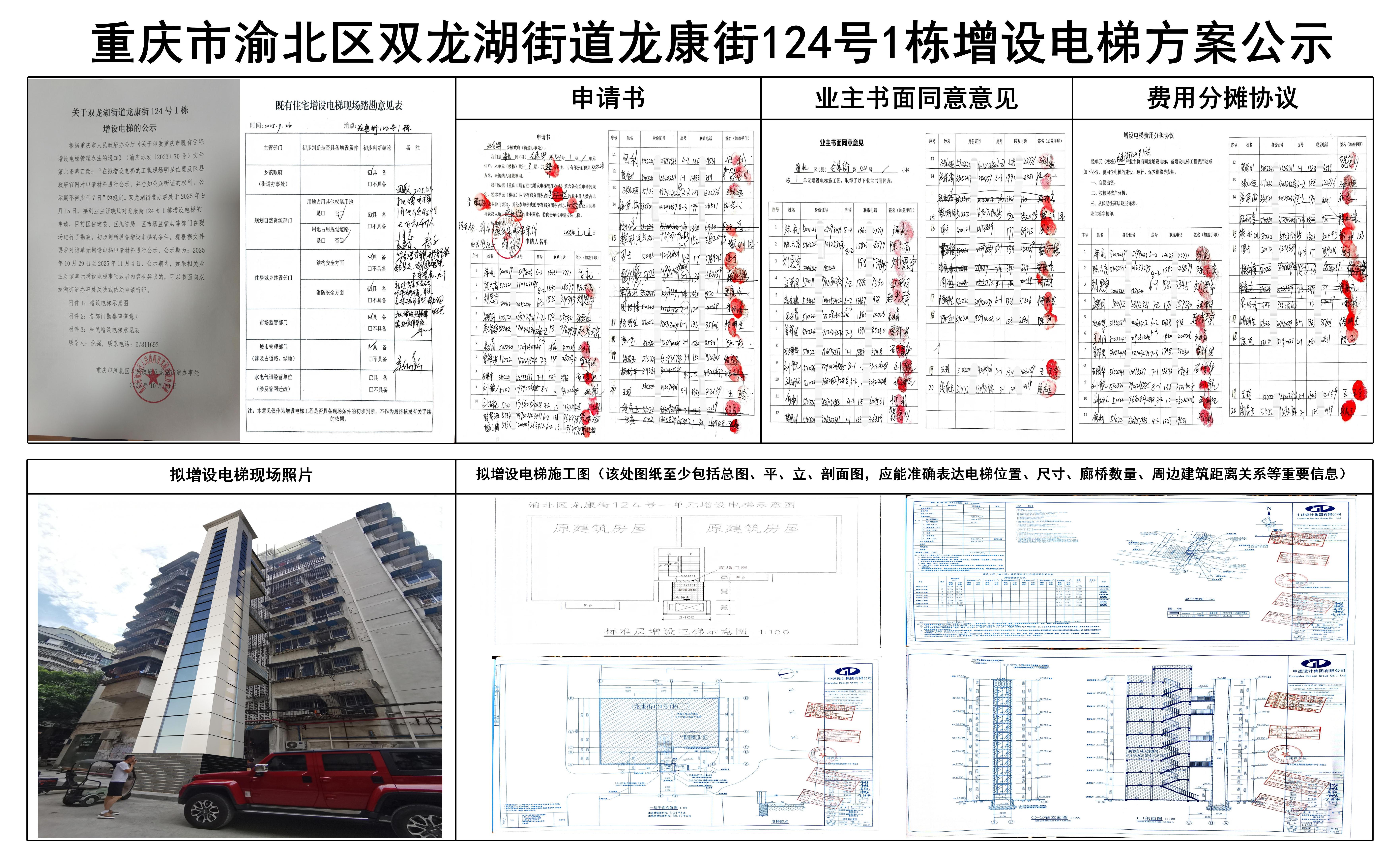 根据重庆市人民政府办公厅《关于印发重庆市既有住宅增设电梯管理办法的通知》(渝府办发〔2023〕70号)文件第六条第四款:“在拟增设电梯的工程现场明显位置及区县政府官网对申请材料进行公示,并告知公众听证的权利,公示期不得少于7日”的规定。双龙湖街道办事处于2025年9月15日,接到业主汪晓凤对龙康街124号1栋增设电梯的申请,目前区住建委、区规资局、区市场监管局等部门在现场进行了勘察,初步判断具备增设电梯的条件。现根据文件要求对该单元增设电梯申请材料进行公示,公示期为:2025年10月29日至2025年11月4日,公示期内,如果相关业主对该单元增设电梯事项或者内容有异议的,可以书面向双龙湖街道办事处反映或依法申请听证。