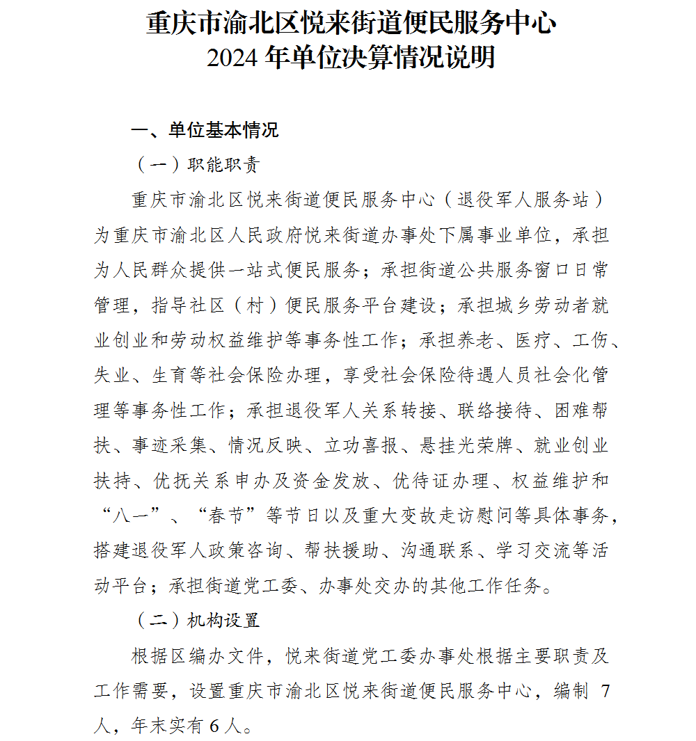 重庆市渝北区悦来街道便民服务中心2024年单位决算情况说明
