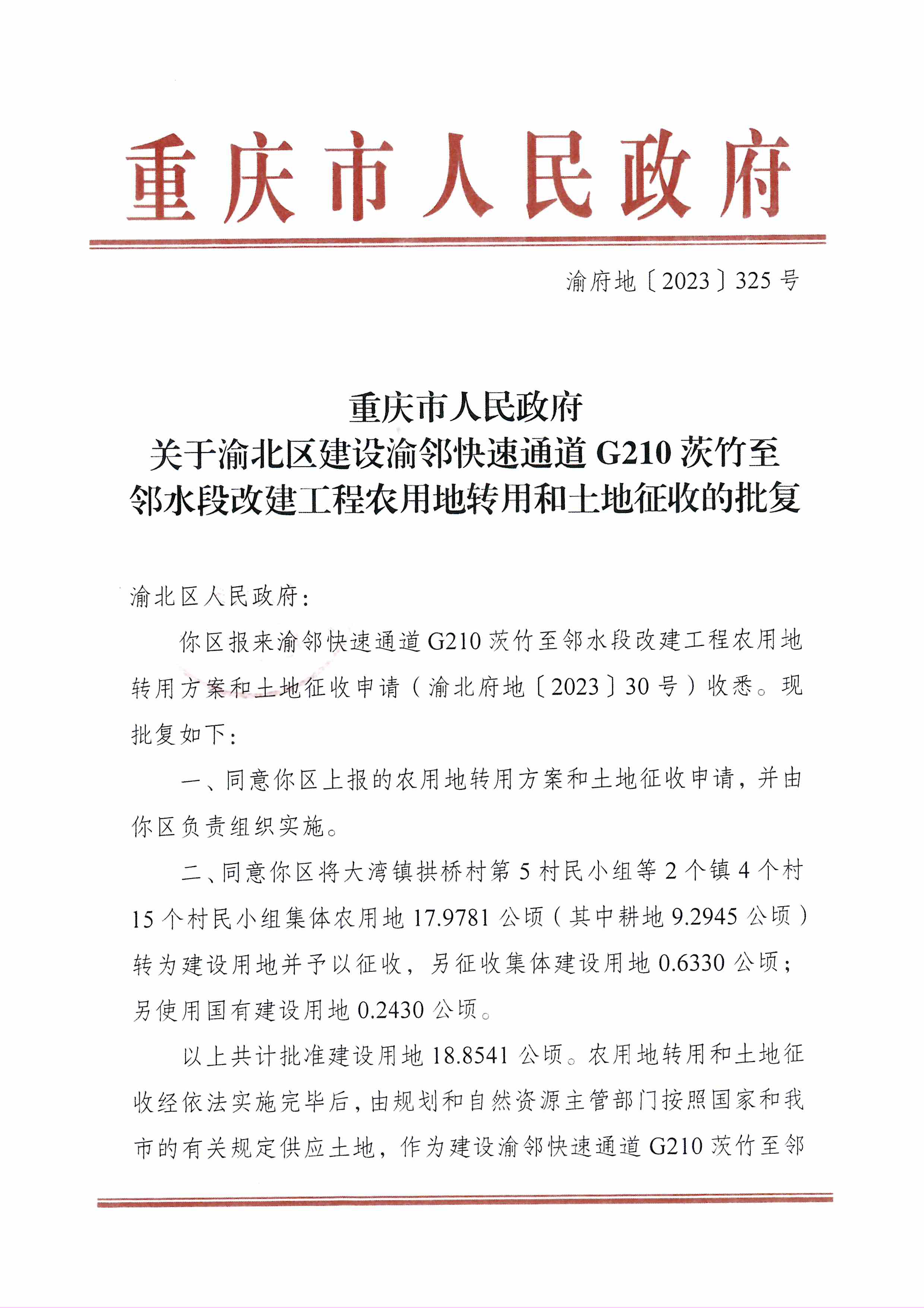 现将市政府《关于渝北区建设渝邻快速通道G210茨竹至邻水段改建工程农用地转用和土地征收的批复》(渝府地〔2023〕325号)转发给你们,请认真遵照执行。
