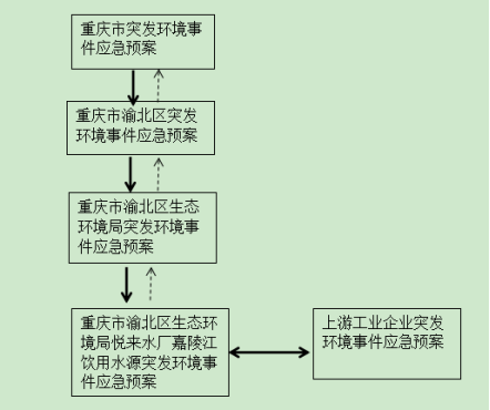 当污染物迁移至悦来水厂水源地应急预案适用范围内或当接到市级指令或接到悦来水厂水源地上游政府部门通报时,启动《重庆市渝北区悦来水厂嘉陵江饮用水水源地突发环境事件应急预案》。《重庆市辐射事故应急预案》《重庆市水上危险货物运输事故应急预案》中对防范和处置次生突发水环境污染事件有相关规定的,从其规定。