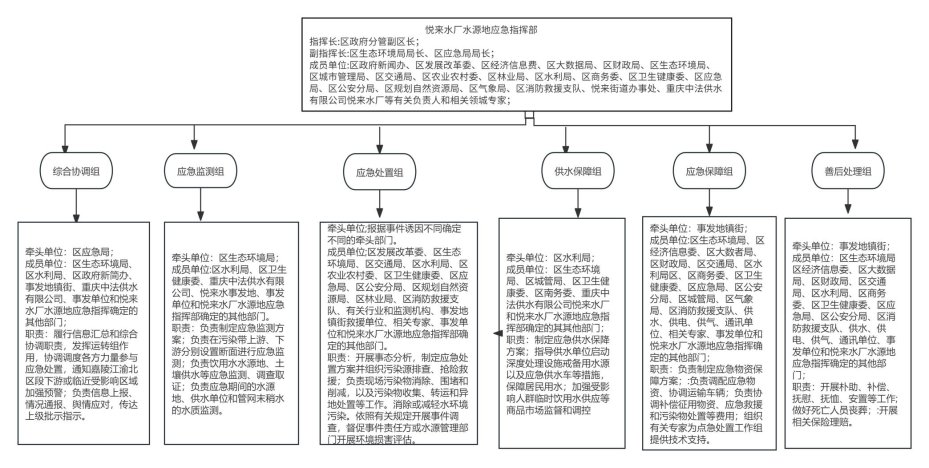 悦来水厂水源地应急指挥部根据工作需要设置综合协调组、应急监测组、应急处置组、供水保障组、应急保障组和善后处理组,工作体系图见附图4。