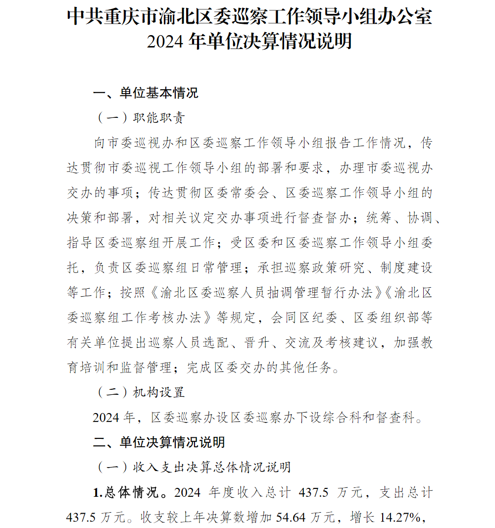 中共重庆市渝北区委巡察工作领导小组办公室2024年单位决算情况说明