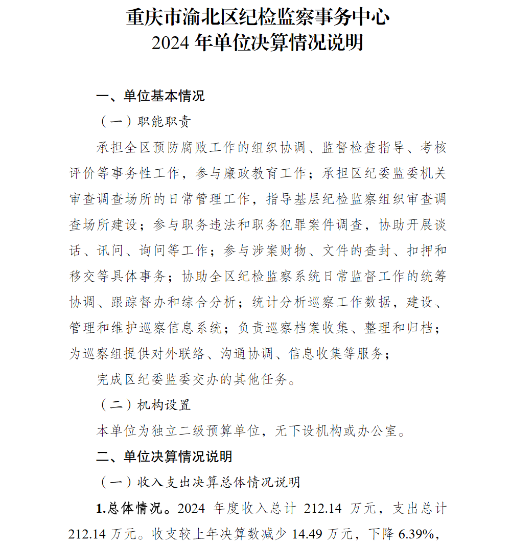 重庆市渝北区纪检监察事务中心2024年单位决算情况说明