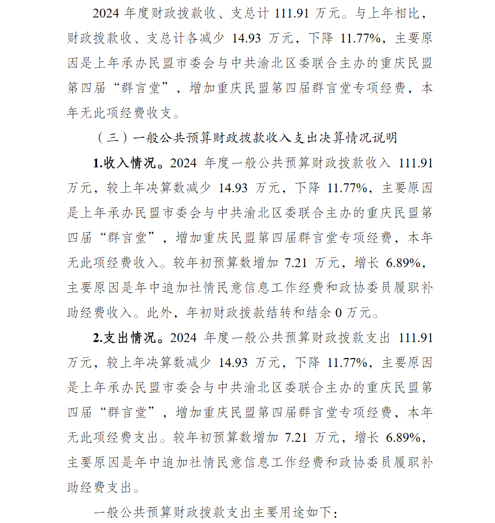 中国民主同盟重庆市渝北区委员会2024年部门决算情况说明